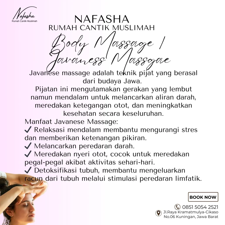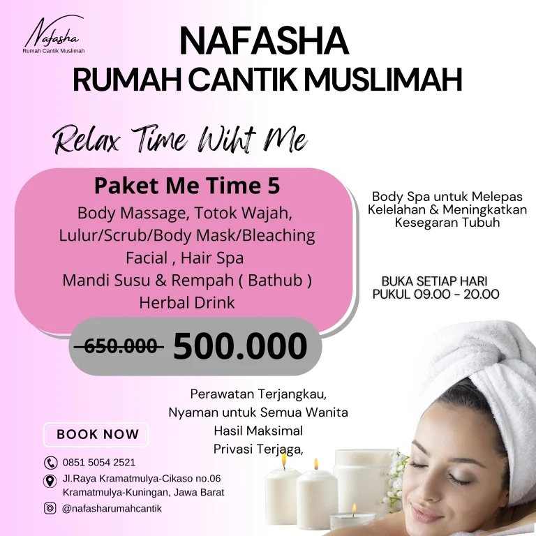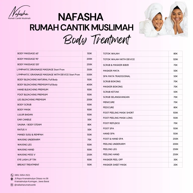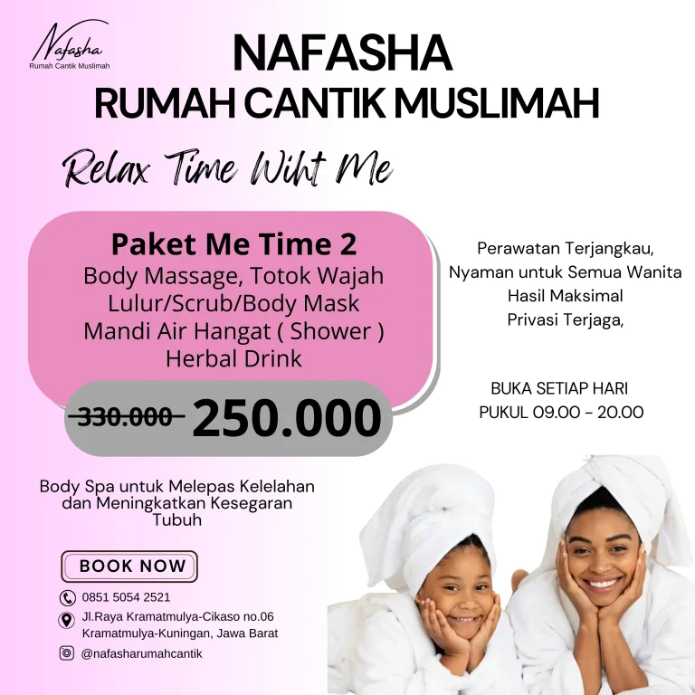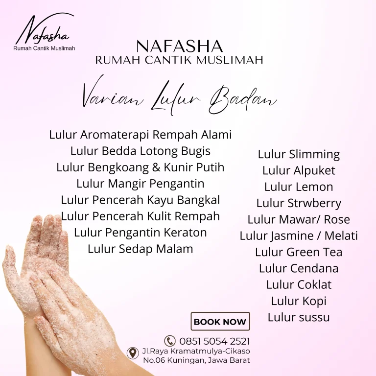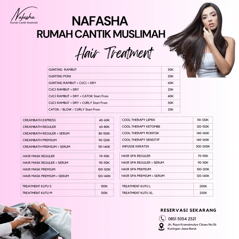 Di Nafasha Rumah Cantik Muslimah, kami memahami pentingnya perawatan diri yang menyeluruh dan alami. Setiap layanan kami dirancang untuk memberikan hasil terbaik, mulai dari perawatan tubuh, wajah, hingga rambut. Dengan bahan alami dan sentuhan profesional, kami pastikan Anda merasa segar dan cantik setiap saat. Jangan tunggu lagi—jadwalkan kunjungan Anda dan rasakan perbedaannya hari ini!